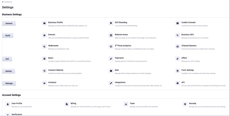 Business Profile, Branding, Connect a Domain, 3rd Party Analytics, Cookie Consent, Collect Payments, API settings, Form Settings, Channel Banners, Business SEO, and more!